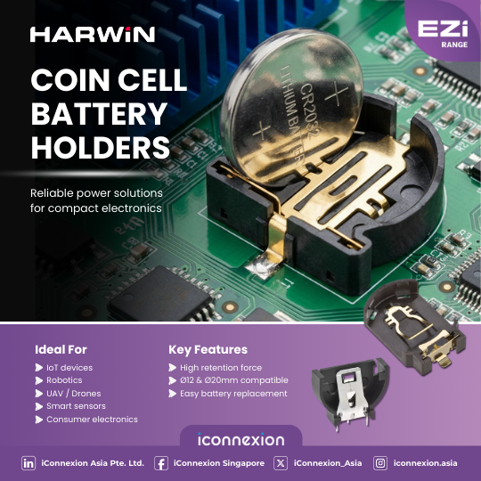 Harwin Coin Cell Battery Holders from the EZi Range provide secure battery retention, reliable electrical performance, and compact design flexibility. Engineered for modern electronics, they are a dependable solution for IoT, robotics, and other space-critical applications requiring stable coin cell power connectivity.