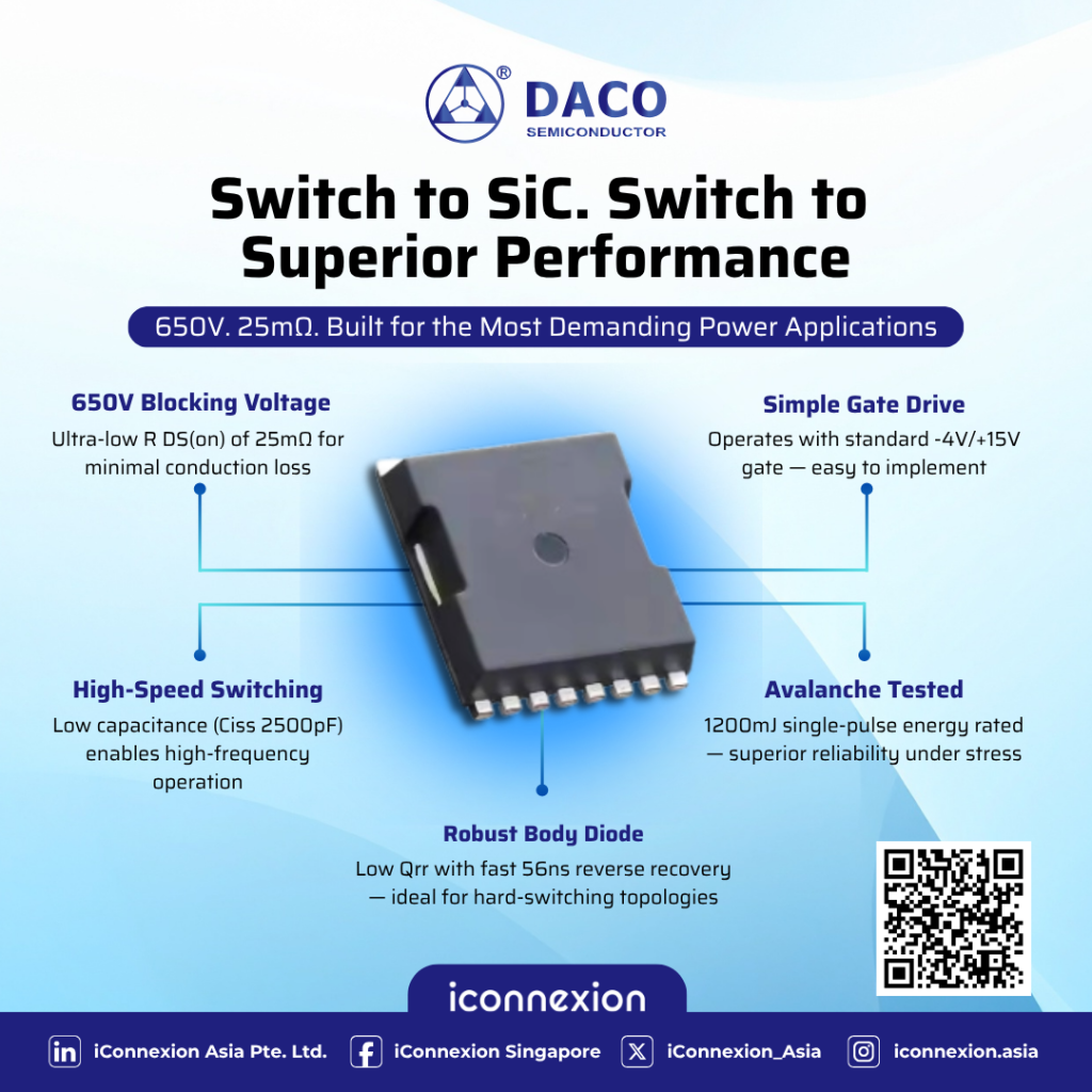 Compact, high-efficiency, and built for demanding power applications, the DACO SiC MOSFET delivers consistent performance under high voltage, high current, and extreme thermal conditions — making it the ideal choice for EV charging, server power, energy storage, and high-frequency power conversion designs.